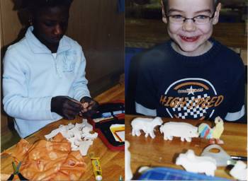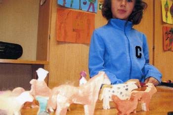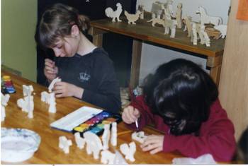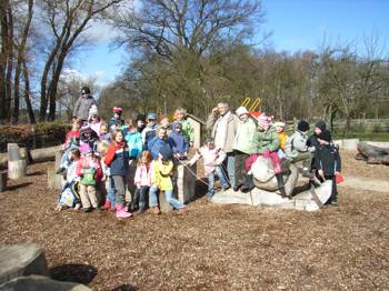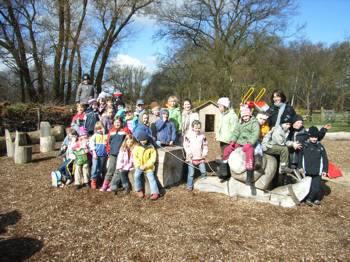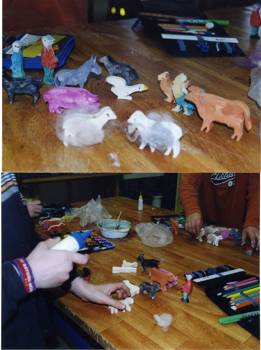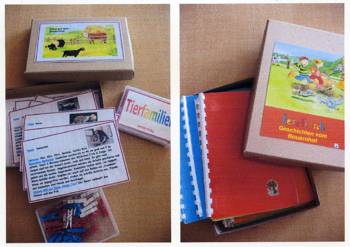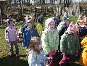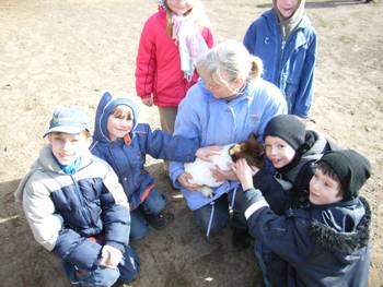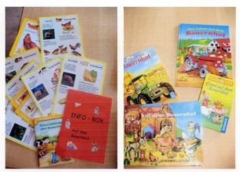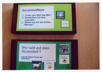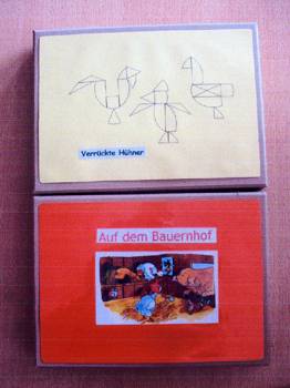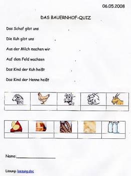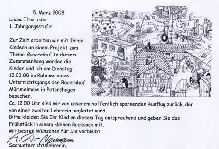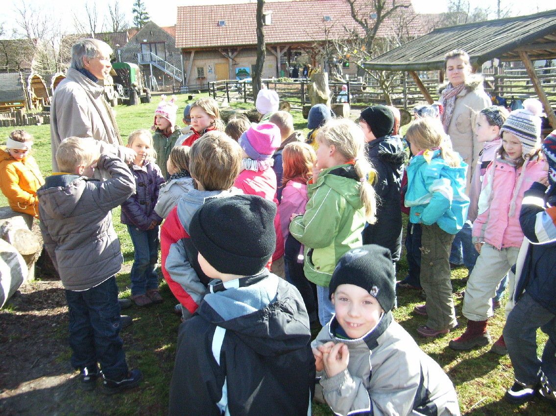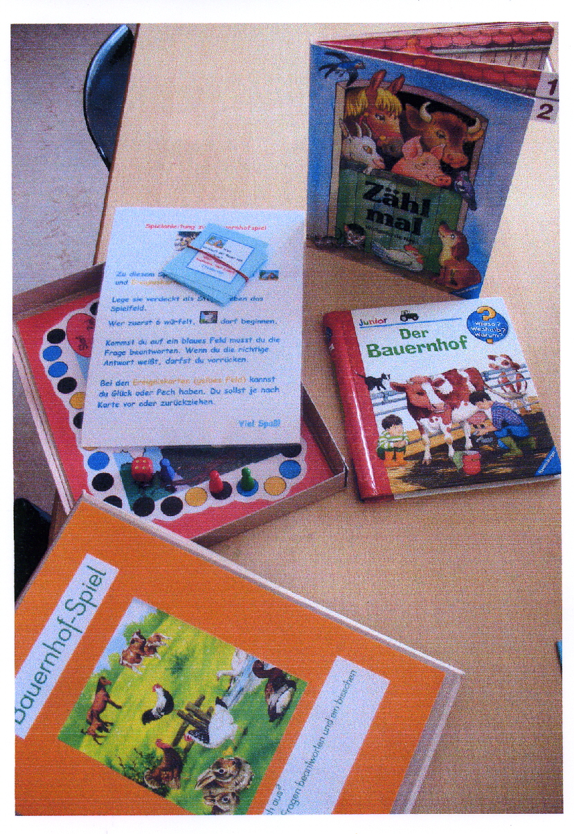 Cirka zwei Wochen vor und zwei Wochen nach dem Osterfest 2008 arbeiteten meine Kolleginnen Frau Lichtenberg, Frau Meißner und ich mit Kindern in der Flexiblen Eingangsphase (jahrgangsübergreifendes Lernen der 1. und 2. Jahrgangsstufe) am Thema Bauernhof. In Vorbereitung auf das Projekt fertigten wir mit Hilfe der Eltern individuelle Freiarbeitsmaterialien für alle Unterrichtsfächer rund um dieses Thema an. So entstanden Lernspiele, Karteien uvm. (siehe Fotos). Mit Eifer und einigem Vorwissen gingen die Schüler ans Arbeiten und erstellten selbst Plakate und kleine Bücher zur Ernährung, Lebensweise und Fortpflanzung der verschiedenen Tierfamilien. Herr von Tümpling stellte jedem Schüler ein aus Holz gesägtes Bauernhof-Set, bestehend aus Bauer, Bäuerin, Ziegen, Schafen, Schweinen, Kühen, Hühnern usw. zur Verfügung. Diese Holzfiguren wurden von den Kindern mit sehr viel Freude mit Farben, Stiften bemalt und mit Wolle, Stoffresten oder Papier beklebt. Einige Kinder bauten auch Tierställe und Scheunen aus Holzresten dazu (siehe Fotos). Den Höhepunkt bildete ein Unterrichtsgang auf den Bauernhof „Mümmelmann“ unweit unserer Katholischen Schule Sankt Hedwig in Petershagen (siehe Fotos). April 2008, A. Wuttke-Neumann.