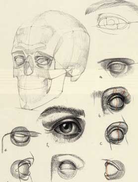 Eine erste Hilfestellung könnte darin bestehen die sichtbaren Teile zu benennen und nach Funktion, Form, Farbe und Größe beschreiben zu lassen. Ein Dia wird dazu gezeigt, vielleicht auch von der Projektion abgezeichnet und mit Hilfe der Schüler beschriftet. Auch die Frage nach der Verteilung von hellen und dunklen Zonen kann man ansprechen. Bei der Übersetzung der Fotografie in die Zeichnung spielen Lineaturen eine bedeutende Rolle, die die Vorlage bereits enthält. Das sind in der Hauptsache die Haare an Wimpern und Brauen, aber auch der Verlauf von Falten und Fältchen, durch den die Wölbungen von Teilformen ablesbar werden. |