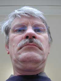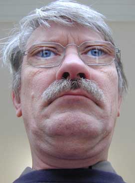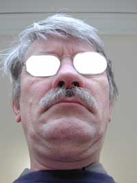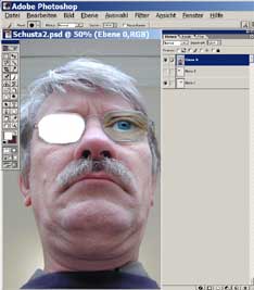 In Photoshop wurden die Brillengläser 'ausgeschnitten'. Das neue Auge wurde auf eine 'zweite Ebene' gelegt und durch 'Skalieren' in eine passende Größe gebracht. Dann wurde es 'dupliziert' und 'seitenverkehrt'. Schliesslich wurden die drei Ebenen in eine neue Reihenfolge gebracht, die oberste Ebene im 'Ebenenfenster' von Photoshop deckt die jeweils darunter liegenden Ebenen ab. Wenn in der Klasse Schüler sind, die bereits Erfahrungen mit Photoshop haben, dann kann man sie darüber hinaus die Montage im Tonwert anpassen lassen ('Farbbalance') und auf einer weiteren Ebene Reflexe über die montierten Augen legen lassen. |